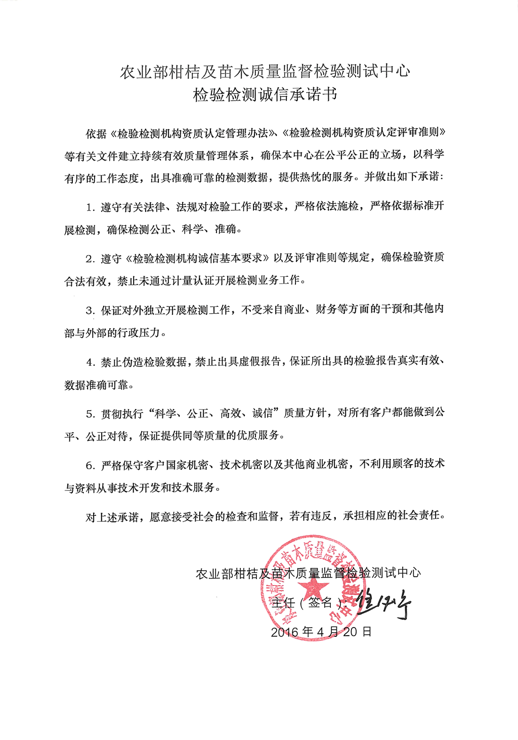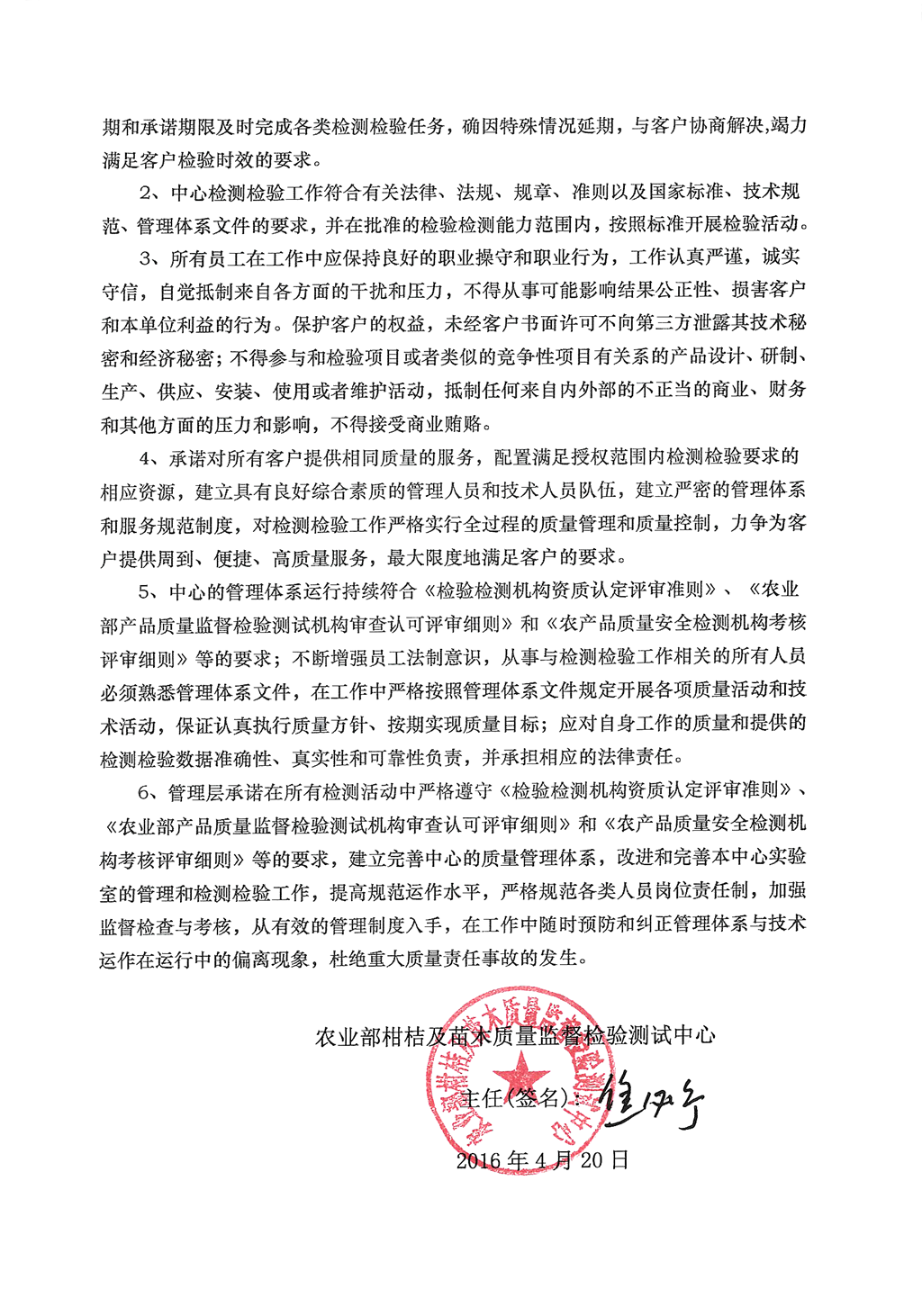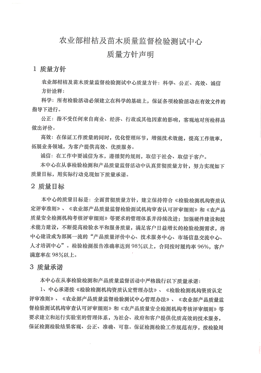 质检中心质量方针声明和检验检测诚信承诺书