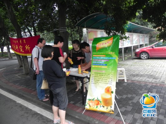 在西南大学大礼堂外,中心成果转化与新产品销售部的同志们向西南大学的老师和学生们介绍了中心各种柑桔新品种和橙汁饮料新产品,并进行了免费品尝活动。