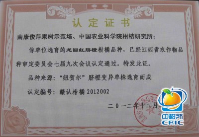 | 7 | 龙回红脐橙 | 南康俊萍果树示范场、中国农业科学院柑桔研究所 | 赣认柑桔2012002 | 江西省农作物品种审定委员会 |