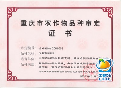 | 1 | 少核默科特 | 中国农业科学院柑桔研究所 江东等 | 渝审柑桔 2008001 | 重庆市农作物品种审定委员会 |