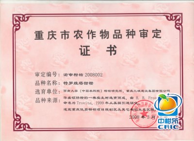 | 2 | 特罗维塔 | 中国农业科学院柑桔研究所、重庆三峡建设集团有限公司 吴厚玖、雷霆、谭志友等 | 渝审柑桔 2008002 | 重庆市农作物品种审定委员会 |
