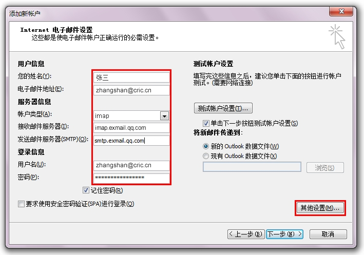 2.在“添加新账户”窗口中,输入您个人的“用户信息”、“登录信息”,而“服务器信息”则按照页面的提示进行填写。