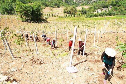 农村新报讯 10日,在竹山县官渡镇桃园村猕猴桃基地,村民们正忙碌着管理猕猴桃。