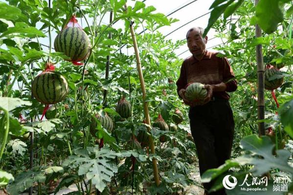 人民网十堰6月7日电 6日6日下午,湖北省十堰市郧阳区柳陂镇挖断岗移民村62岁的郝元明正在自家大棚地里管理1.6亩吊长早佳冰糖西瓜。