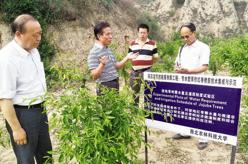 陕西米脂县石沟流域孟岔村800亩山地红枣集雨微灌示范基地是由西北农林科技大学和榆林市科研人员联合攻关建成的。据了解,通过示范,该基地每亩红枣灌溉由原来沟灌+管灌169立方米,减少到每亩灌水量22~50立方米;五年生红枣产量每亩达到1320公斤,是无灌溉传统稀植红枣每亩134公斤的10倍,同时,微灌技术可提高红枣的产量。图为6月3日,西北农林科技大学米脂红枣试验站首席专家汪有科(左二)正在向参观者介绍枣树节水微灌技术。 本报记者 耿苏强 摄