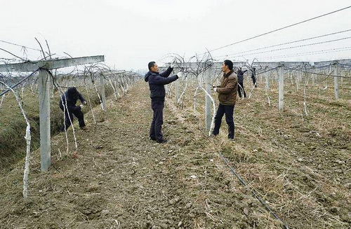 燕争护(中)指导农户架设猕猴桃架
