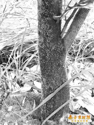 微信网友:柑橘树主干上遍布像霉菌一样的东西,叶子也基本枯萎,请问是什么情况?如何处理?(左图)