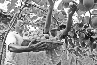 9月5日,在四川省泸州市纳溪区白节镇新桥村4组生态猕猴桃基地,种植户龙朝华(左)、胡登华忙着采摘猕猴桃装箱出售。今年新桥村猕猴桃初挂果,预计产量近20万斤,产值300多万元,种植户户均增收1万元以上。 金其云刘信琼摄