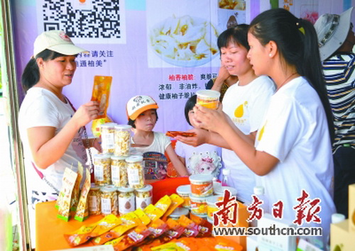 店员给市民介绍蜜柚深加工产品。何森 摄