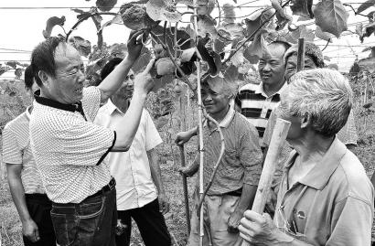 胡育乾(左一)在猕猴桃园向村民传授技术。