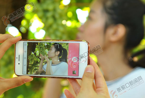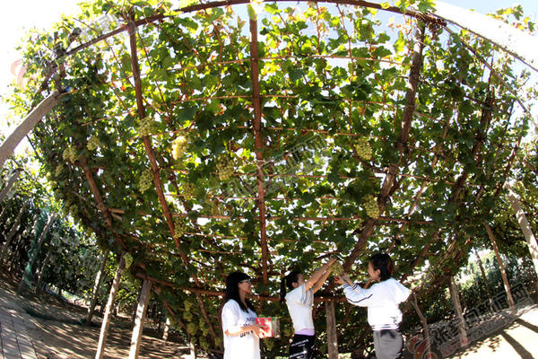 9月23日是二十四节气的“秋分”,张家口宣化区“宣化城市传统葡萄园”中郁郁葱葱的漏斗形架上白牛奶葡萄硕果飘香,到了每年品质最佳期,吸引众多游客前来采摘游玩。图为游客在观后村种植区采摘白牛奶葡萄。陈晓东闫宗春何大为摄