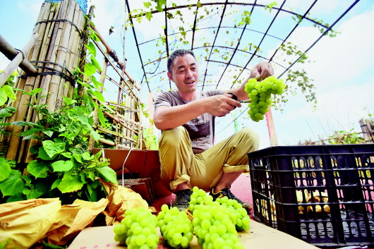 阳光透过葡萄叶洒在葡萄园,晨风微凉,藤叶间馥郁的甜香萦绕,引来忙碌的蜜蜂,藤上的水晶葡萄一串串颗粒饱满,晶莹剔透,孙贵川顾不上擦汗,小心翼翼地把葡萄修剪后放进筐中。“今年光照足、雨水少,葡萄收成比去年多三分之一左右。”孙贵川笑着说。