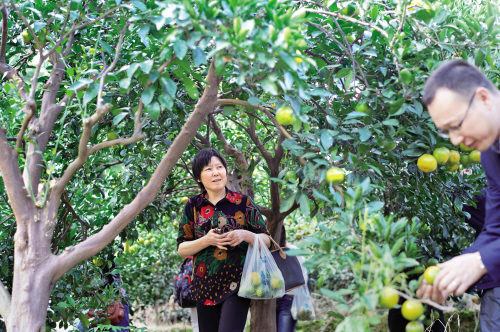 在柑橘采摘节活动现场,最吸引人的莫过于漫山遍野的丰收橘林,一抬头便是满眼金黄,一层叠一层,行走其间,听着远处清脆的鸟叫声,闻着近处幽幽的橘香,便是一幅再灵动不过的诗情田园画。远道而来的游客们兴致勃勃,他们拿上剪刀,提上塑料袋,轻装徒步上山,一边用手机、相机记录着目之所及的美景,一边兴冲冲地挑选着他们眼中的美味橘子。