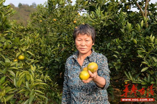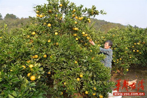 10月23日,湖南省隆回县北山镇小角村留守妇女王晚桃在摘桔子。连续6年来,王晚桃承包村里闲置的80亩农场,专门种植橘子、脐橙、柚子、柿子,每年收入达15万元。 (罗理力 徐文/摄影报道)