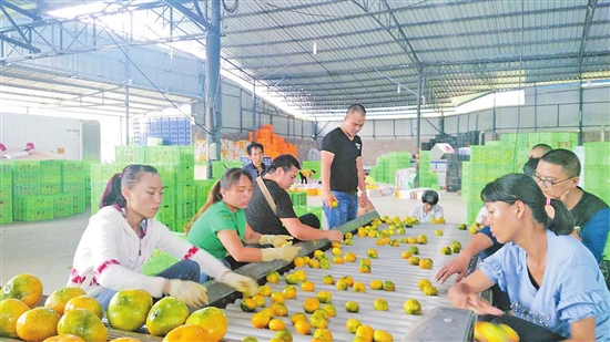 近日,华宁县华溪镇鸿兴柑桔分选厂的员工正在分拣机旁分拣柑桔,目前每天分拣加工柑桔近100吨左右。
