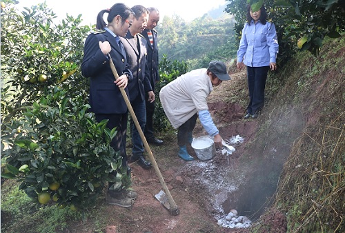 根据实地查看,为强化果农对柑橘大实蝇危害的认识,进一步开展大实蝇防控工作,减轻果农来年的损失,工作人员现场向果农讲解并示范了大实蝇蛆柑的防控与处理技术:一是塑料袋密闭处理技术;二是深埋处理技术;三是沼气池处理技术;四是开水煮沸处理技术。
