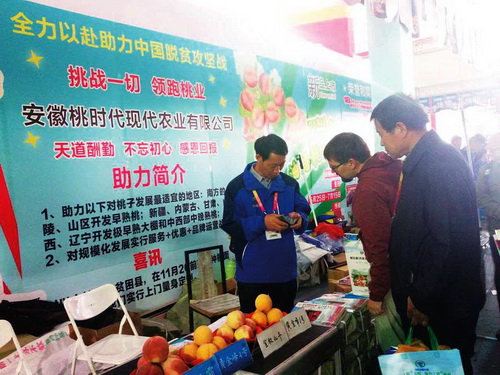 11月8日,在第24届杨凌农高会D馆,安徽省光战桃树研究所参展的“永不服软桃”――中秋红蜜3号吸引了老外驻足观看,了解其桃的特征。