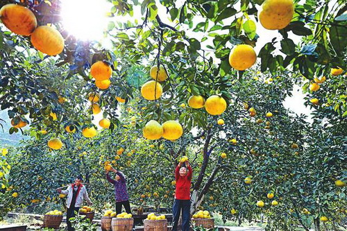 重庆日报讯 日前,重庆市梁平区荫平镇乐英村三组,村民在采摘梁平柚子。初冬时节,被称为“中国名柚之乡”的梁平区柚子成熟,当地农民忙着采摘、运输、销售金黄色的柚子,一派丰收繁忙景象。特约摄影刘辉