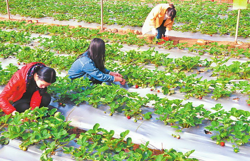 近期,位于通海县杞麓湖南岸的田园生态农庄里,游人正在采摘成熟的草莓。据悉,近年来,通海县依托杞麓湖南岸秀丽的风光和气候条件发展草莓种植,按照“旅游观光、自助采摘”的运行模式,不断引进草莓新品种、新技术,为游人提供多样化的休闲采摘选择。 特约通讯员 赵徽 摄
