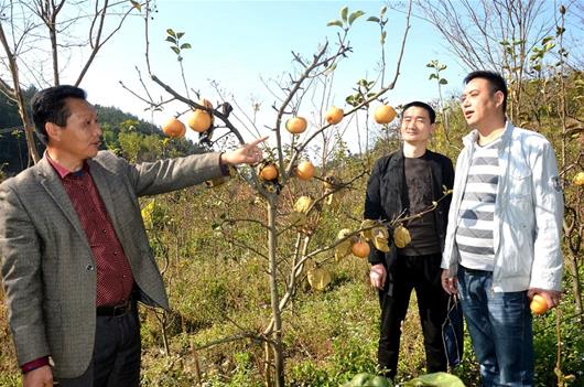 农村新报讯 罗田县平湖乡财政所扶持沙塘角村发展800亩晚秋黄梨,今年喜获丰收,总收入200余万元,26个贫困户户平收入2万元。图为11月25日财政所工作人员到沙塘角村察看黄梨生长情况。