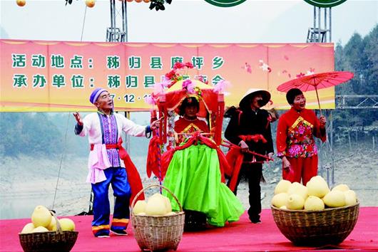 三峡晚报讯 12月12日,秭归县磨坪商会在磨坪乡升坪湖畔举行2017首届磨坪贡柚节,来自上海、武汉的客商与磨坪贡柚种植户、合作社签订了近200万元的磨坪贡柚销售协议。(本报记者杨慧凌 摄)