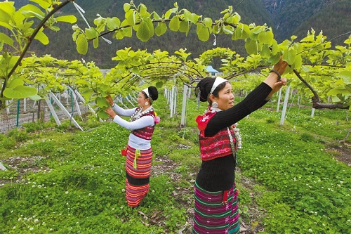 图为察隅县下察隅镇村民正在猕猴桃种植园内打理果树。图片来源:中国西藏新闻网 摄影:唐斌