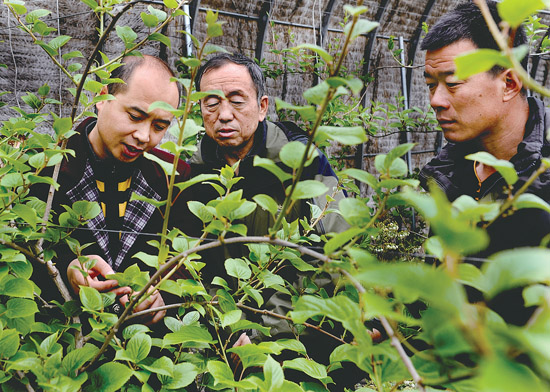 连日来,市软枣猕猴桃协会邀请中国农科院小浆果资深专家沈育杰研究员,结合我市软枣猕猴桃产业现状与发展前景,与百余位会员分享种植、销售等方面的经验,为我市乡村振兴助力。图为专家在汤山城镇龙泉村一处温室大棚内,手把手向农民传授软枣猕猴桃种植管理技术。 记者 宋永昆摄