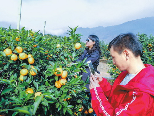 近日,在新平县平甸乡磨皮村磨皮大寨沃柑基地,挂满枝头的柑桔引来了不少观光客。近年来,新平县通过系列扶持政策,采取“公司+农户”模式,加快发展以柑桔为代表的水果产业,在“褚橙”品牌引领下,形成了龙头企业带动农户发展柑桔规模种植的模式,全县柑桔产业迅猛发展,县内的褚橙庄园、桔荔庄园等柑桔种植基地吸引了众多旅游爱好者前来观光。 特约记者 周宗林 摄