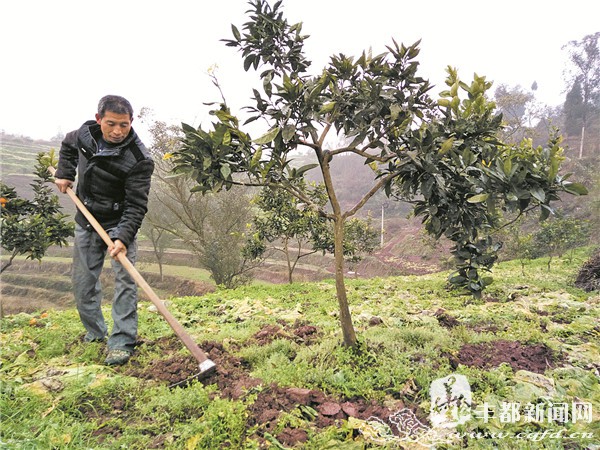丰都保合镇普子场村漫山遍野柑橘树枝叶繁茂、碧绿青翠,阵阵微风吹过,淡淡的泥土清香一缕缕沁人心脾,果农李福权正忙着给柑桔树除草施肥。