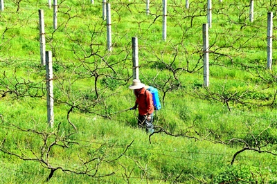 3月27日,位于忠州街道护国村的良玉葡萄基地的工人在管理葡萄树。