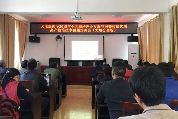 当前,柑桔生产在大境瑶族乡发展迅猛,已成为农业支柱产业,为了更好的引导柑桔产业向规模化、产业化、科技化发展,让果农们掌握科学的柑桔种植管理技术,3月30日,灵川县大境瑶族乡组织乡里的整个农业组成员、各村委“两委”班子成员、大境村委、永同村委、新寨村委种植大户共60人积极参加了中共灵川县委组织部组织的2018年全县柑桔产业发展导向暨柑桔优质高产栽培技术视频培训会议。