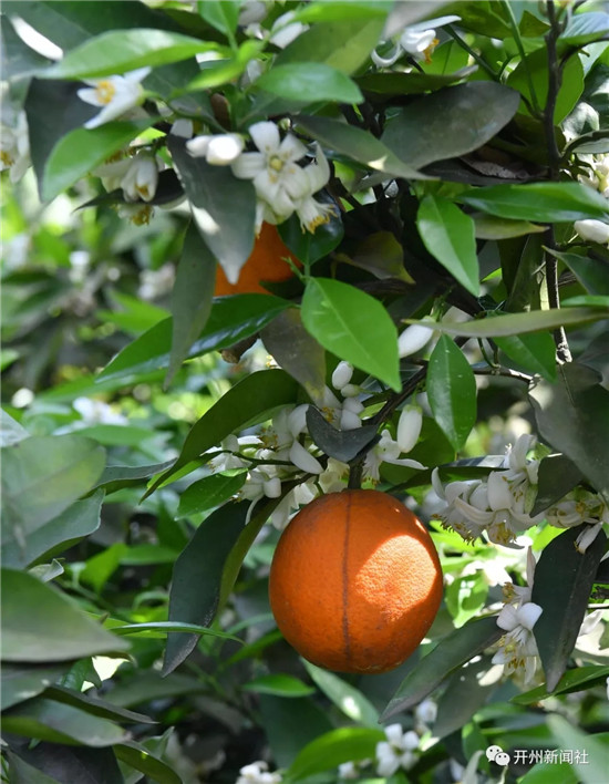 据介绍,开州拥有中国春橙第一县美誉,春季的橘海开出大面积的白花,而同时橘树上还挂着柑橘。游客在赏花时还可自由采摘、品尝。据了解,这种花果同树是由于把去年结在树上的柑橘用科技方法保留在树上,在春季果树开花时就出现了花果同树的景观。