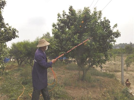 4月13日,在眉山市东坡区三苏乡望苏村,村民李星成正在给春见果树喷洒农药,进行果树管理。