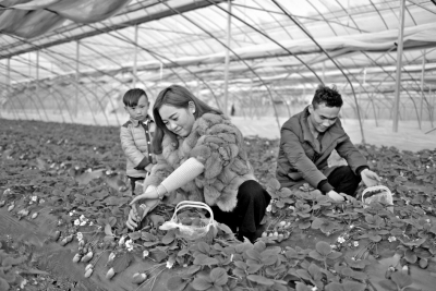 近年来,针对当地农民多年种植草莓的实际情况,江苏泗洪县引导和帮助广大果农选用消费者喜爱、市场销路好、稳产高效的“甜宝”“红颜”等优良草莓新品种种植,并采取示范带动和免费技术培训等多项帮扶措施。优良草莓新品种的成功推广大大增加了草莓种植户的收入。目前,该县优良品种草莓近万亩。图为城头乡的一处“良种草莓园”内,市民正在采摘“甜宝”草莓。 程文锦摄