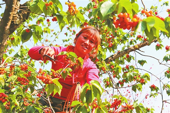 走进罗美华家的山地里,只见樱桃树硕果累累。微风吹过,绿叶中的樱桃露出点点红色,十分诱人。罗美华一边采摘樱桃,一边喜滋滋地介绍说,家里虽然只种有七八棵樱桃树,但由于成熟早,果大、核小、甜味高。去年卖樱桃的收入1万多元,今年樱桃长势好,估计樱桃收入会更高。