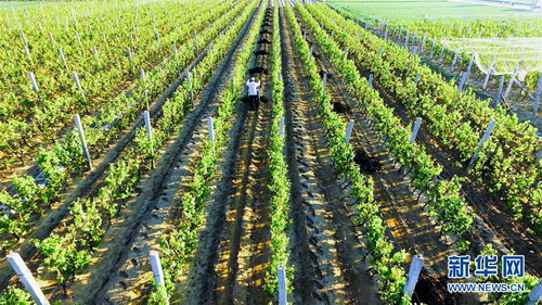 5月3日,河北省遵化市团瓢庄乡农民在葡萄园劳作(无人机拍摄)。新华社发(刘满仓 摄)