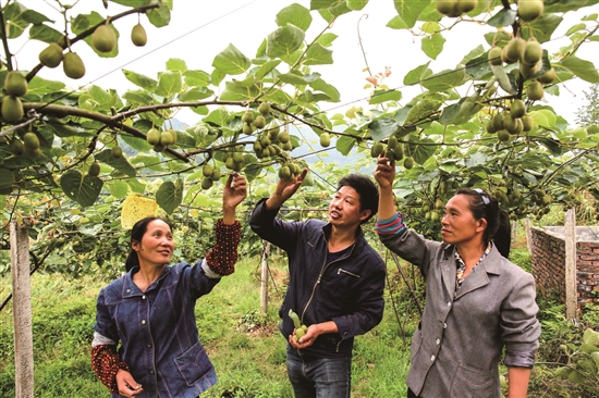 两年前,山高路远的岐山村还是省定贫困村。脱贫攻坚决战中,六米多宽的奔康大道修到岐山村下的王场。山区脱贫要奔康,关键还在“领头羊”。镇党委大胆启用大学生村干部上山担任村支书,又动员走出岐山的能干人回乡当上村主任。稳住传统的高山茶叶,转型适宜当地地理气候的猕猴桃,岐山短短数年的变化实实在在。海拔近千米的气候、绿色的生态环境,岐山猕猴桃早早就被成都的客商“盯上了”,从去年开始就没有担心过销路。村主任王正海介绍,自家的30多亩猕猴桃今年挣个40余万元没问题,村民自己精心打理的果园,每亩的效益还要高一些。