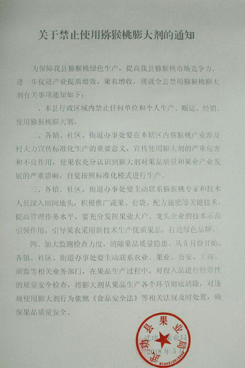 二是严禁使用猕猴桃膨大剂。当前,正值猕猴桃的开花座果期,也是禁止使用膨大剂的关键时期。县果业局抢抓关键农时,要求各镇办(社区)组织人员加大检查力度,坚决禁止使用猕猴桃膨大剂。