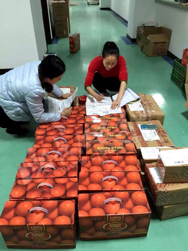 12月8日,巴东县金果茶业公司员工正对照客户采购信息填写快递单,准备将打包好的新鲜柑橘,通过物流发往全国各地。