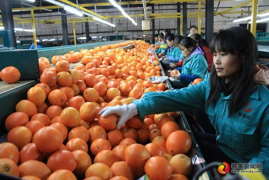 近日,位于兴国县的将军红实业集团有限公司万吨脐橙保鲜库内,工作人员在挑选优质脐橙,准备装箱运往北京和成都。近年来,该公司通过精品路线销售将脐橙销往全国各地,还出口至俄罗斯以及东南亚等。据了解,该公司今年预计出库脐橙1.5万吨。 刘慧婷 摄