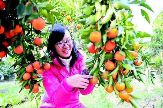湖北日报讯 元旦假期,游人在宜昌市夷陵区鸦鹊岭镇海云村橘园里游园采摘晚熟柑橘。新年伊始,当地大宗柑橘销售已经收尾,但海云村村民周开恩从中科院引进的迟熟柑橘新品种“世纪红”挂满枝头,吸引游人慕名而来采摘。近年来,夷陵区调整柑橘品种结构,建成6个“世纪红”柑橘示范园,种植面积达3000亩,所产柑橘获市场认可,同时也帮助橘农增收。 (视界网 张国荣 摄)