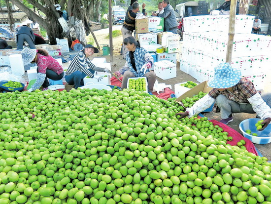 1月8日,在元江县红河街道大水平社区至红光农场五队的千亩连片青枣种植区,客商收购的青枣堆满路旁,工人按照大中小三个品级进行分级装箱。据了解,元江青枣由于光照充足,果子糖分积累高,甜脆可口,又在秋冬季上市,所以深受外地客商和顾客的喜爱,产品一直俏销省内外。目前,元江热坝区种植的七千多亩青枣已进入采摘销售高峰期,收购价基本保持在每公斤4元左右。