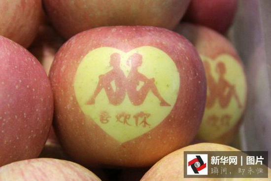 带字传情苹果热销,苹果表面带有表白文字。2月14日情人节还有一个月都不到,商家为抓住这一商机已各出奇招。山东滨州一超市便推出带字传情的苹果。