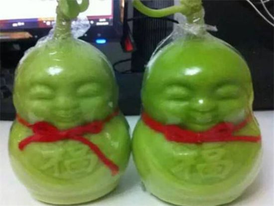 据越南媒体报道,这种产自中国的“财神梨”颜色翠绿,外形似娃娃,面露笑容,憨态可掬,其胸前还有“福”字。每个“财神梨”高约10厘米,重200克左右,外面用保鲜膜裹得严严实实,有的还用一根红线绑着,果子上方还有一根长长的茎。新华国际客户端了解到,这种类型的水果被称为“造型水果”或“艺术水果”,是通过水果成长塑造模具对成长期的水果进行塑性,使其按照一定的形状生长而成的。这种在中国被称为“娃娃梨”的“造型水果”近两年在国内不少地方都有销售。