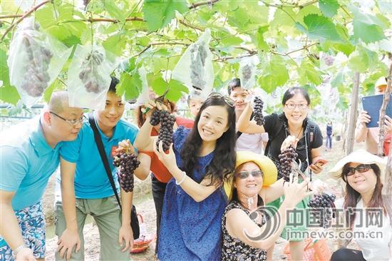 作为巨峰葡萄的一个早熟品种,夏黑葡萄香味浓郁,酸甜可口,受到不少江门市民的喜爱。近日,江报电商组织了50余人的粉丝团,前往礼乐向荣村的向荣琴姨葡萄园摘夏黑葡萄。