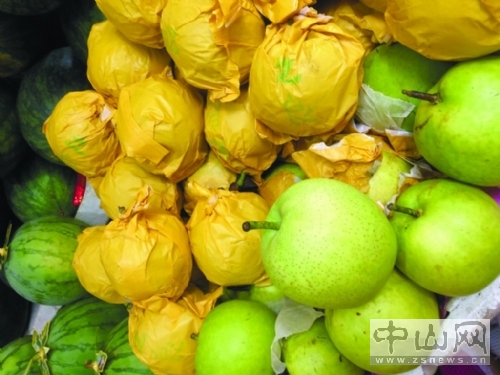 7月21日上午,在华柏市场进门口靠左边的水果档上,女档主正在把刚到货的苹果梨摆上台面,一边拆包装一边给记者介绍,“这是新到的苹果梨,你看,似苹果吧。”女档主拿了一个给记者细细观看,从样子看,这种梨还真像苹果,只是颜色不同,外表呈绿色。