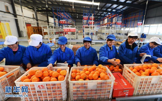 12月6日,湖北秭归脐橙深加工龙头企业屈姑农业集团的员工在分装鲜橙。
