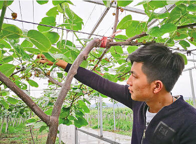 丁宪强在检查猕猴桃的长势