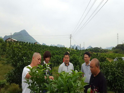 茂名市农业局党组成员、副局长、水果局局长叶颖邦(右二)在平乐县考察沃柑生产情况