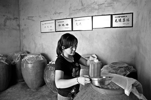 陈从文说,加工葡萄酒的工艺也不复杂,首先是选择成熟味道甜的葡萄,去掉果蒂冲洗干净,然后把葡萄倒在盆里,用手捏碎,装缸发酵。二十六七天后,开缸滤渣,留下的就是优质葡萄酒了。